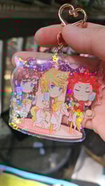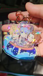 3" double sided Acrylic keychains adorned with a holographic filter on one side. Get your favorite trio from the Kingdom Hearts franchise! All come with a rose gold heart shaped key ring.